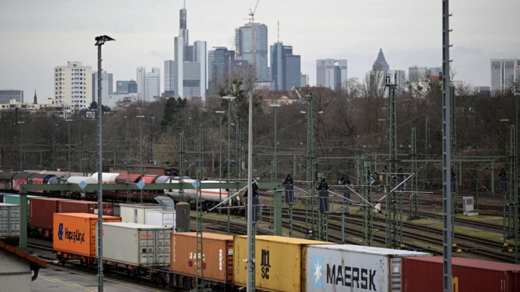 Cargo trains stand on the railway tracks at a transshipment station in Frankfurt am Main, western Germany, as in background can be seen the city’s skyline, on January 23, 2024.