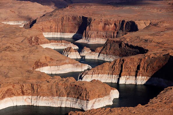 In this aerial view, The tall bleached “bathtub ring” is visible on the rocky banks of Lake Powell on June 24, 2021 in Page, Arizona.
