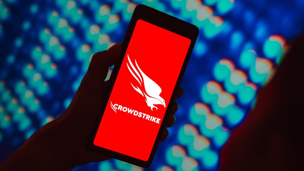 In this photo illustration, the CrowdStrike Holdings, Inc. logo is displayed on a smartphone screen.